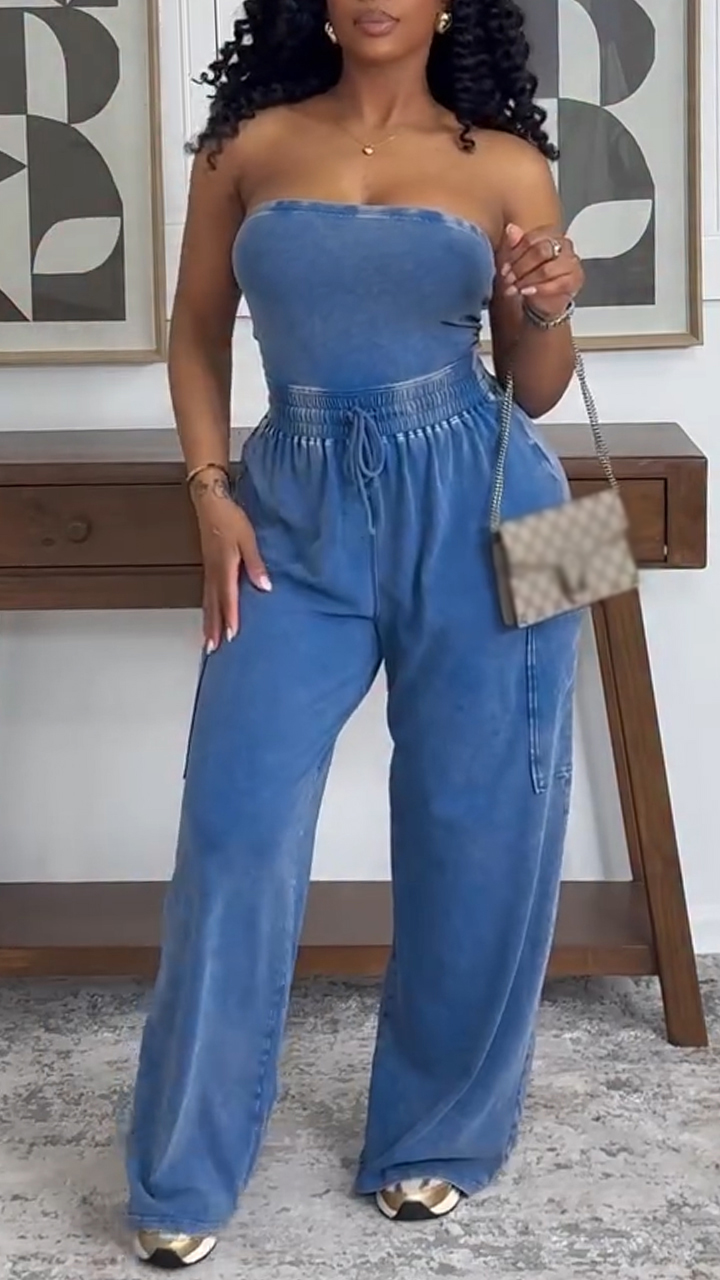 Women Strapless Patchwork Casual Denim Jumpsuit with Temperament