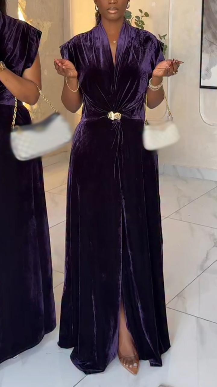 Women V-neck Solid Color Velvet Elegant Temperament Dress