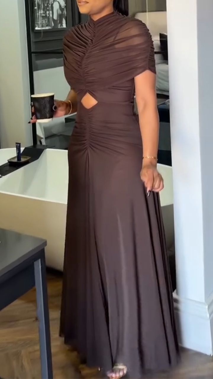 Women Round Neck Patchwork Hollow Pleated Solid Color Elegant Temperament Dress