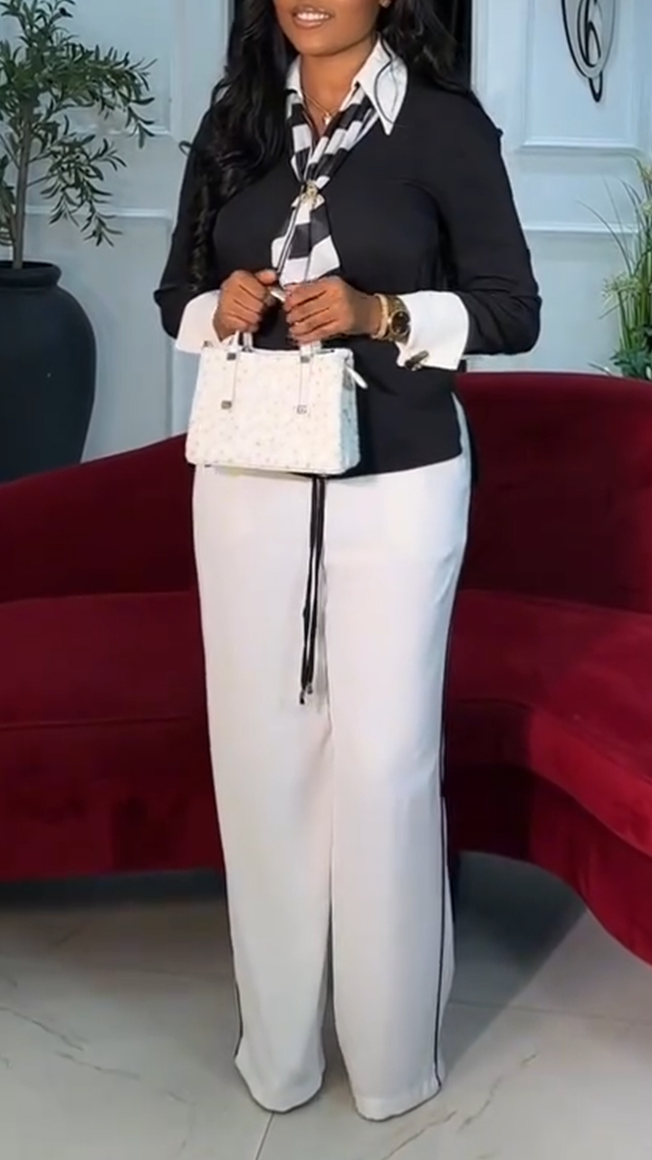 Women Collared Fake Two-piece Top + White Pants