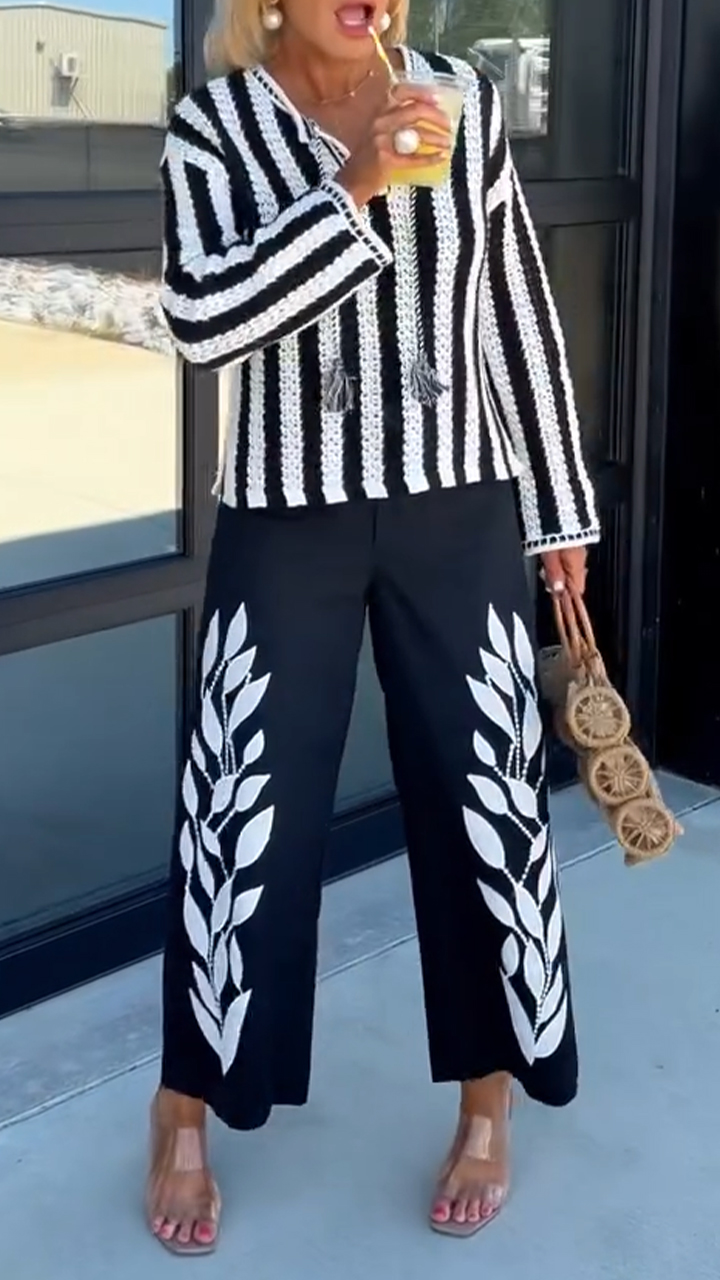 Women V-neck Knitted Vertical Pattern Top+Printed Pants Casual Set