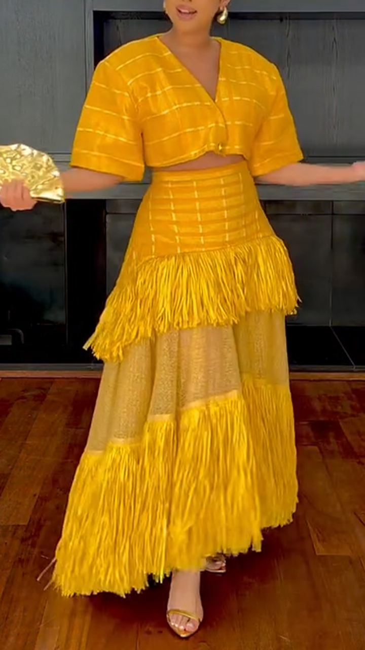 Women V-neck Striped Top + Patchwork Tassel Half Skirt Dinner Party Style Set