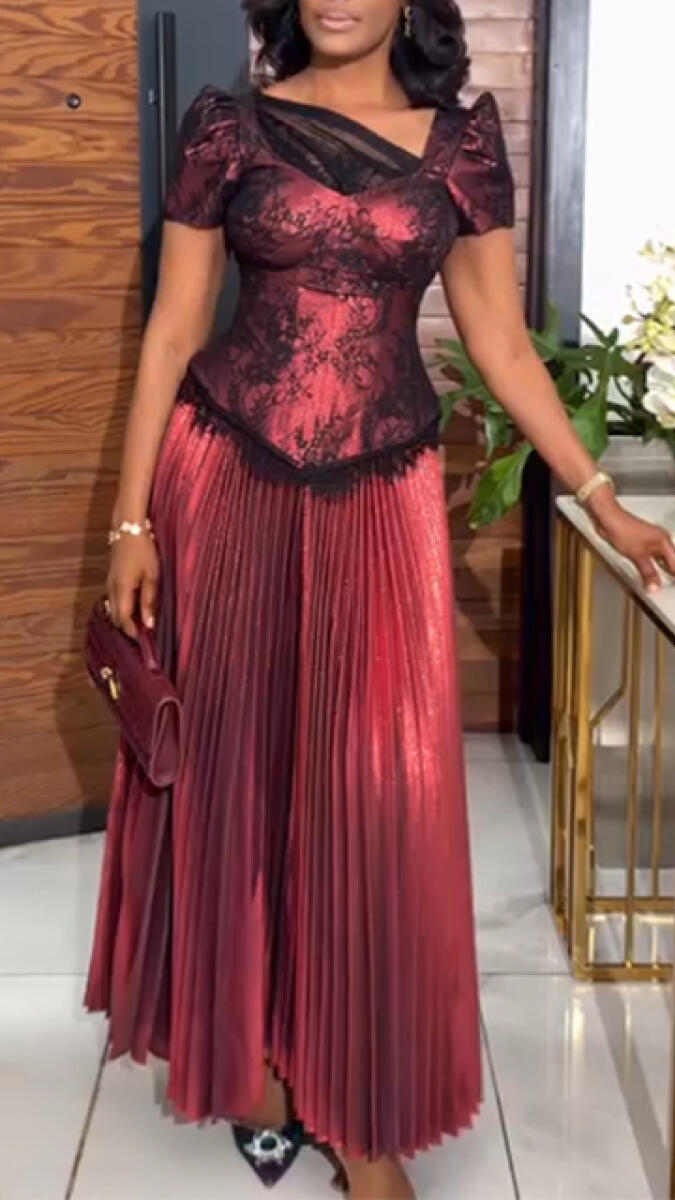 Women Square Collar Patchwork Pleated Elegant Temperament Dress