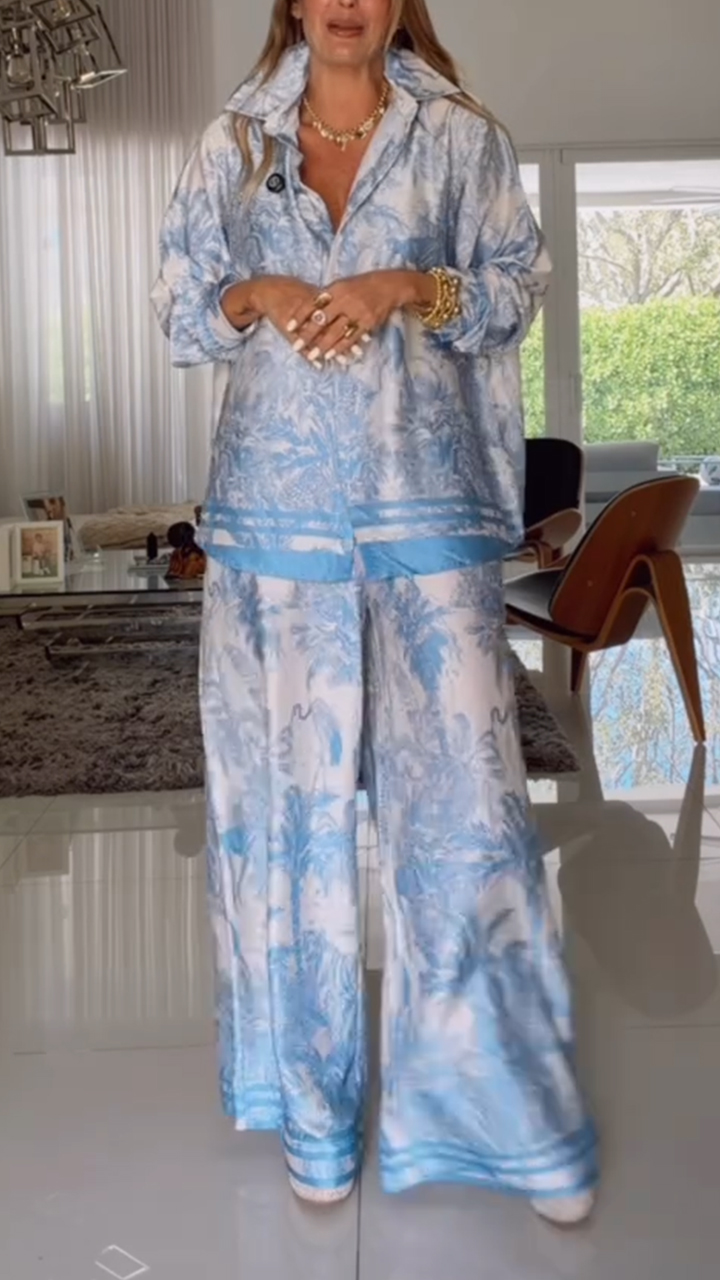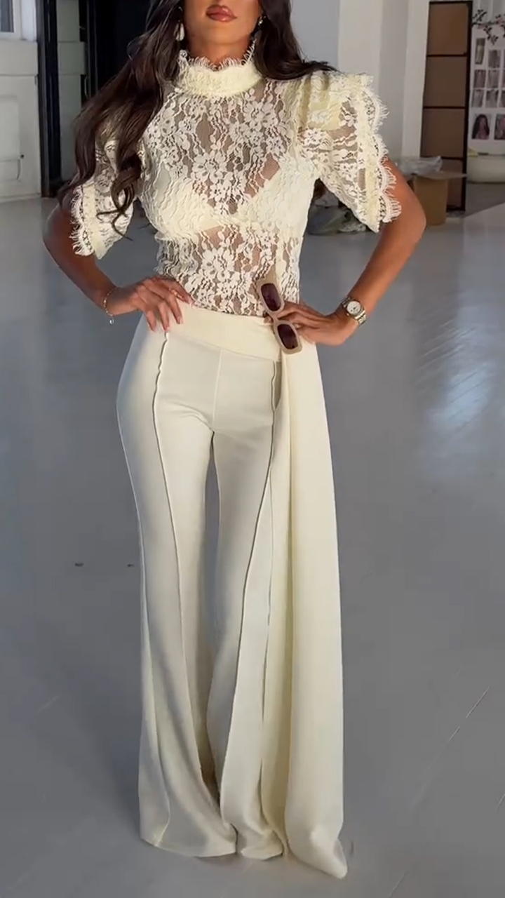 Women Round Neck Lace Printed Top+ Pants Elegant Temperament Set
