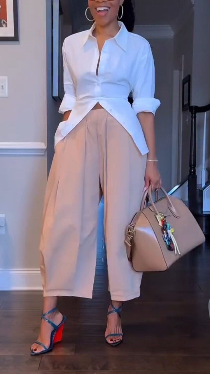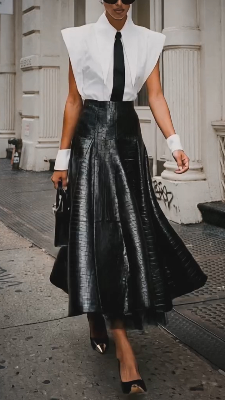 Women Collared Shirt + Leather Midi Skirt Elegant Casual Suit