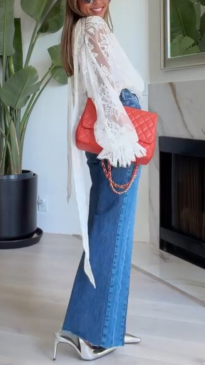 Womens Sheer Printed Cover-up + Washed Denim Casual Suit
