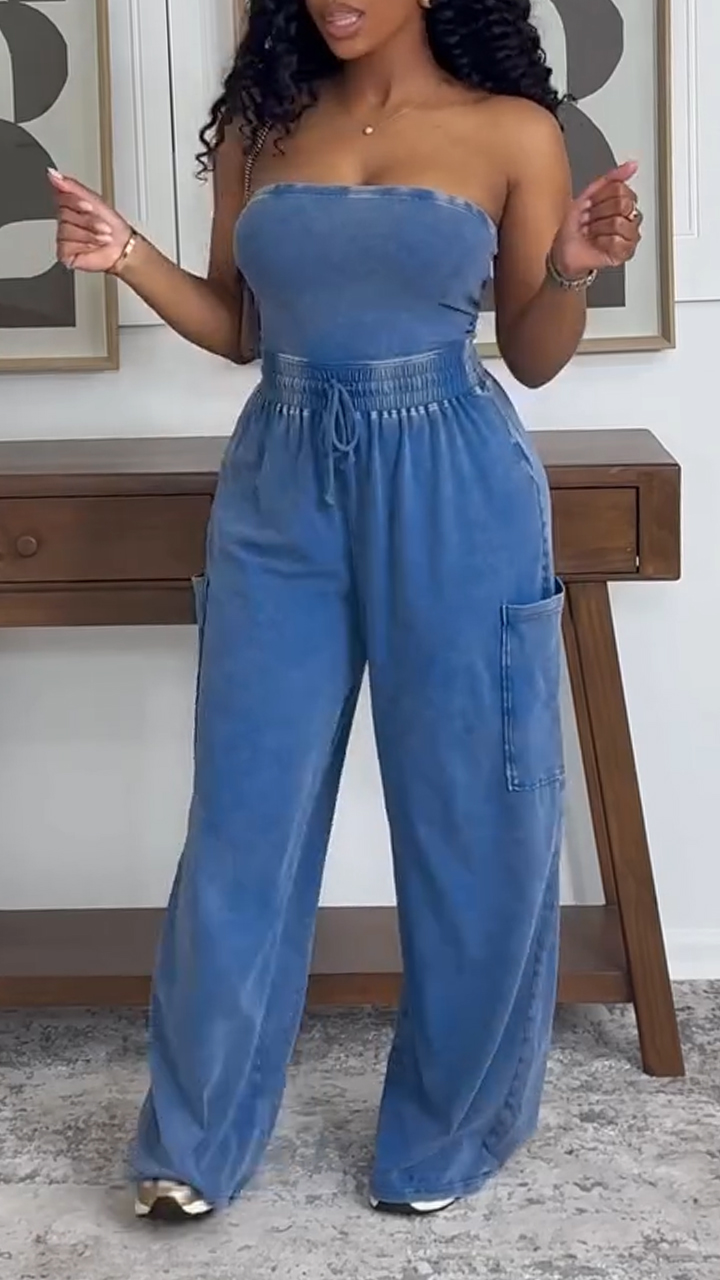 Women Strapless Patchwork Casual Denim Jumpsuit with Temperament