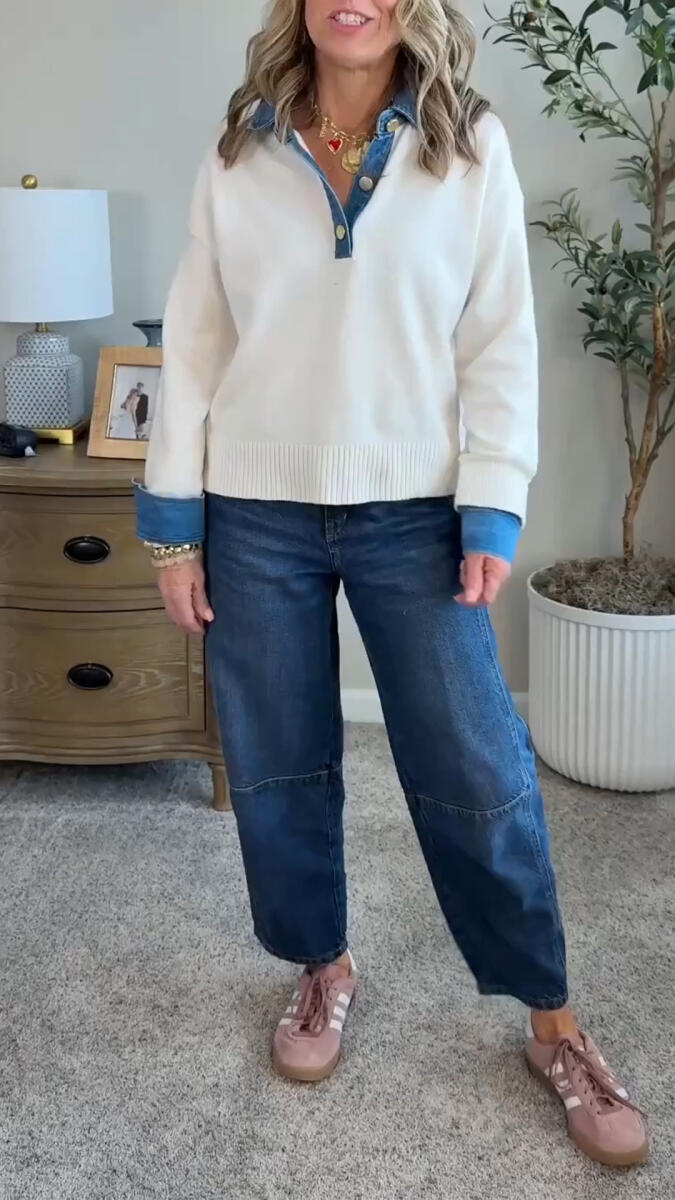 Women Collar Patchwork Denim Top+ Jeans Casual Suit