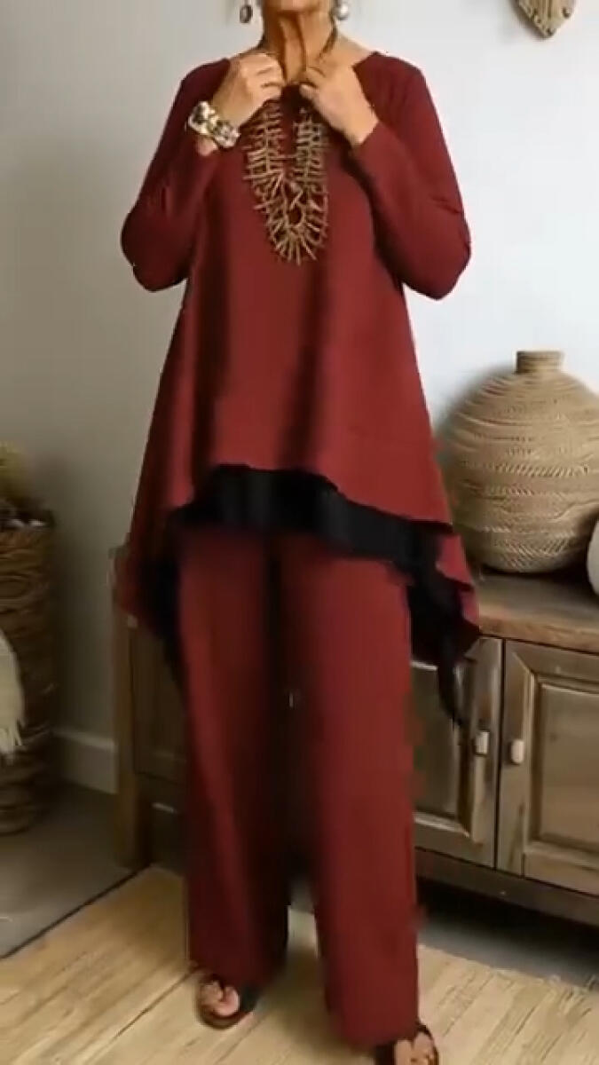 Women Round Neck Patchwork Top+ Pants Casual Suit