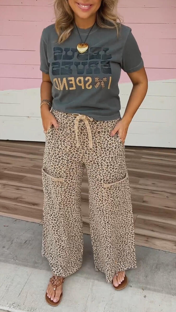Women Round Neck Printed Top+ Leopard Print Pants Casual Set
