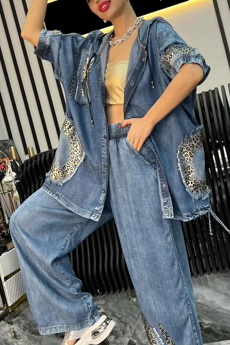 Women Round Neck Hooded Patchwork Denim Casual Suit